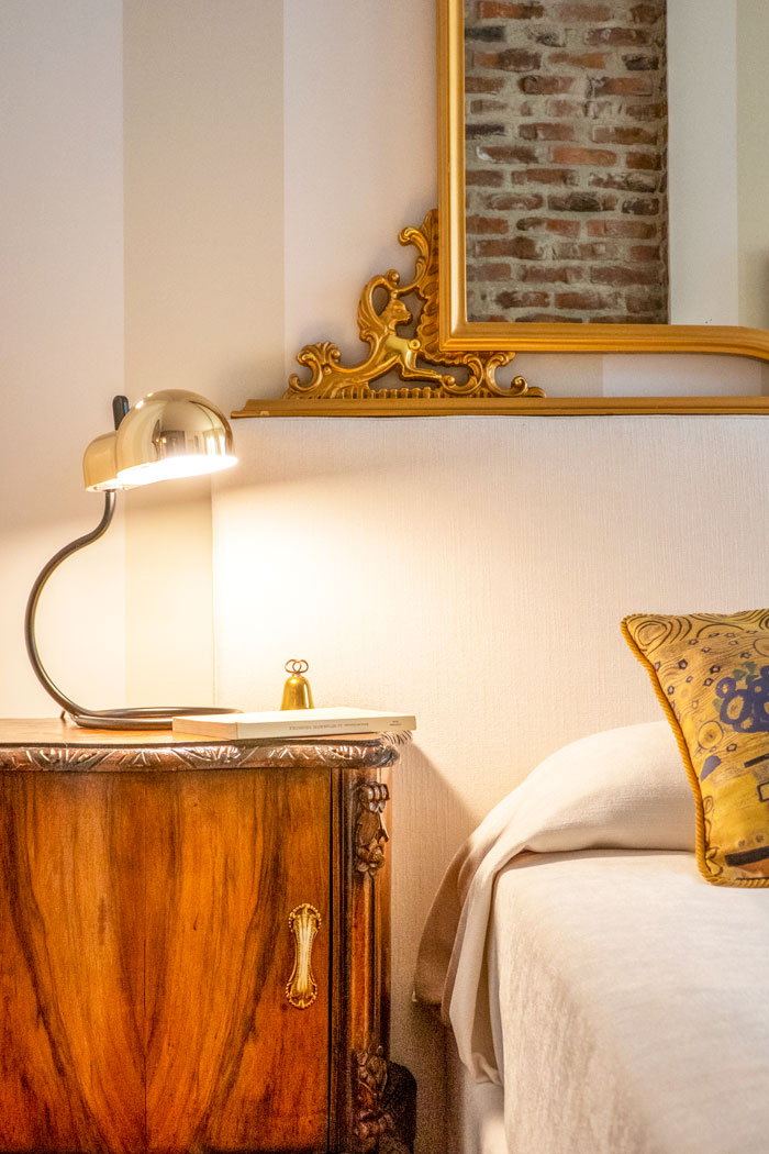 Sui fianchi letto lampade Minitopo di Joe Colombo per Stilnovo rieditate in versione oro