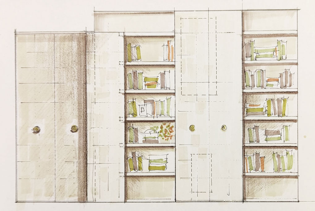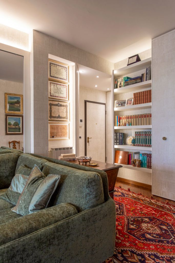 Nel piccolo ingresso le quinte retroilluminate, tappezzate con carta da parati Elitis, creano nicchie attrezzate a libreria e direzionano verso l’ampio spazio giorno con zona conversazione, angolo cottura e pranzo.