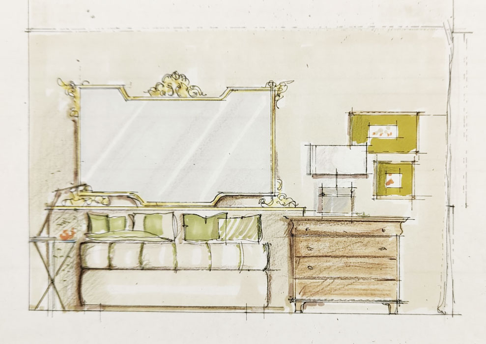 Sono presenti un cassettone, fianchi letto in stile Chippendale e una grande specchiera (appartenente ad una credenza) che è stata trasformata in testata letto.