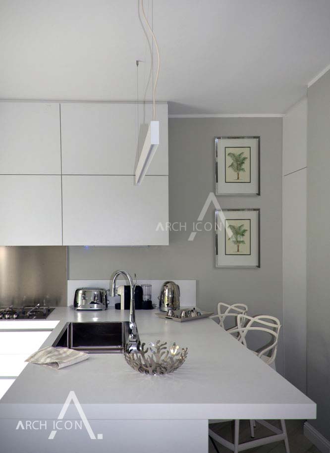 La cucina monolitica bianco latte ”dialoga” con il verde salvia delle pareti.