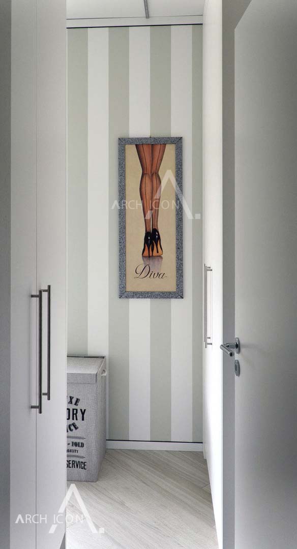 La consolle rivestita in tessuto con finitura a borchie bronzate, l’importante letto con testata “Bergere” ed il contenitore del pranzo in foglia argentopatinata, sottolineano la sartorialità dell’abitazione.